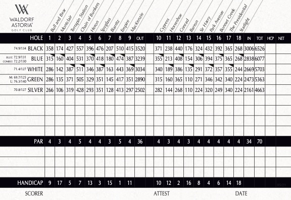 Visually stunning and immensely playable, our Par 72 golf course is enhanced by natural elements like majestic cypress trees lining the fairways and features a five-tee system to accommodate golfers of every caliber. The Waldorf Astoria Golf Club measures an impressive 7,108 yards from the Professional Tees and maintains a course rating of 74.6 and slope of 139.